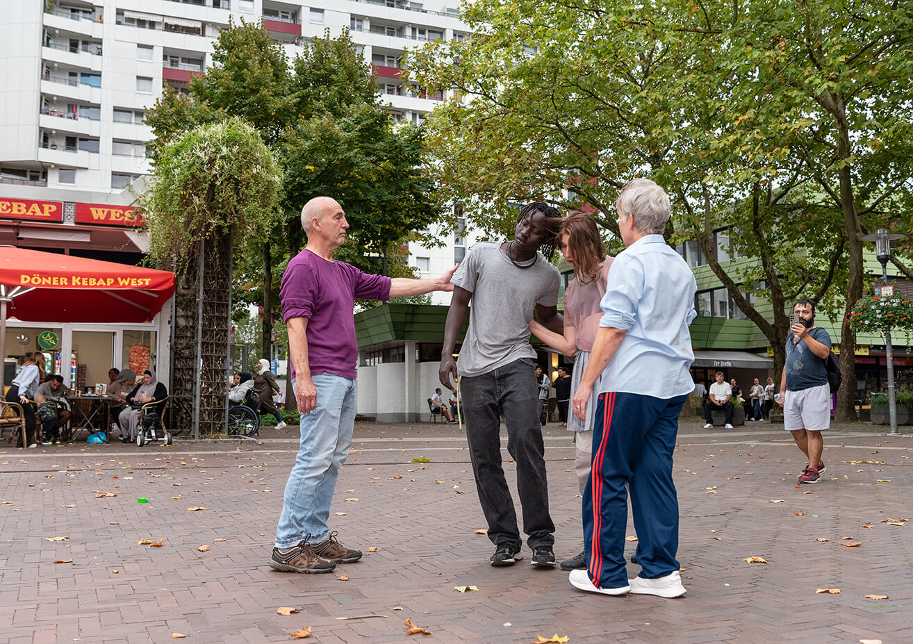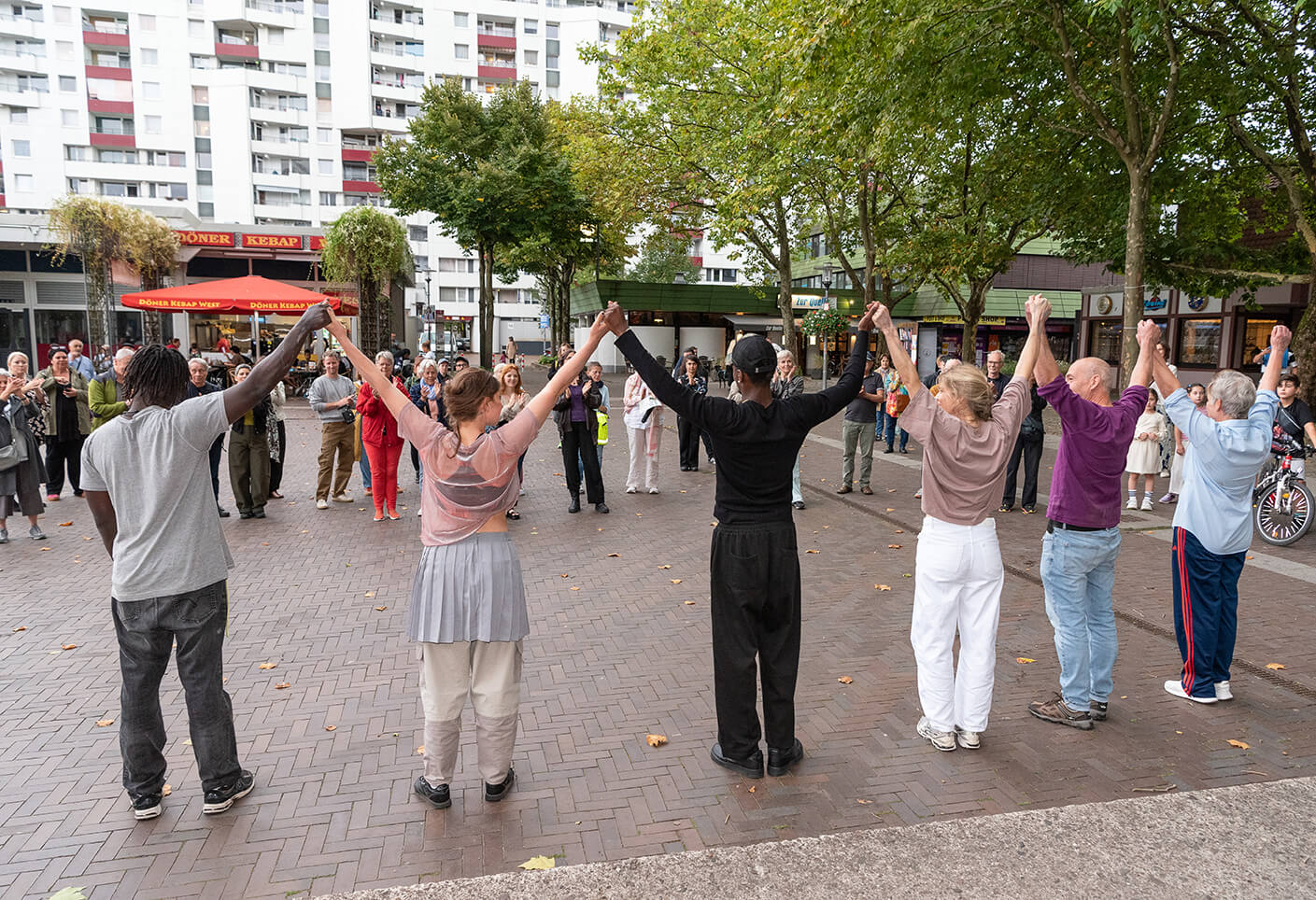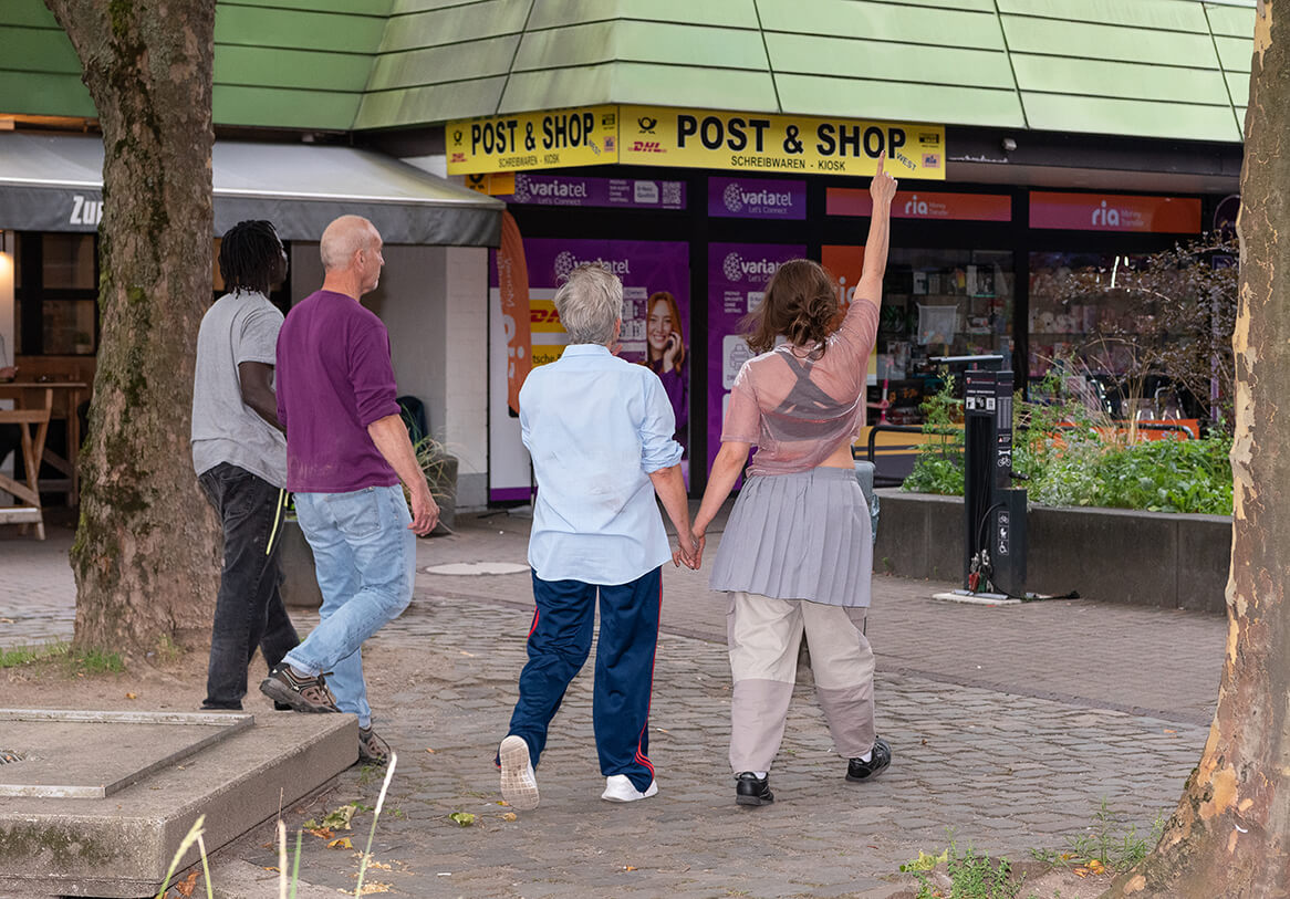 Daria Nazarenko aktivierte den öffentlichen Raum um den Berliner Platz. Mit der Performance CARDIAC zeigte sie einen Nachklang aus den gemeinsamen Tanz-Workshops mit der Nachbarschaft des Senior/innen-Treffs und des Jugendclubs Ratingen-West und experimentierte mit dem daraus entstandenen Bewegungsvokabular des Alltäglichen. Diese Zusammenarbeit fokussierte sich auf die Brücke zwischen Jung und Alt.