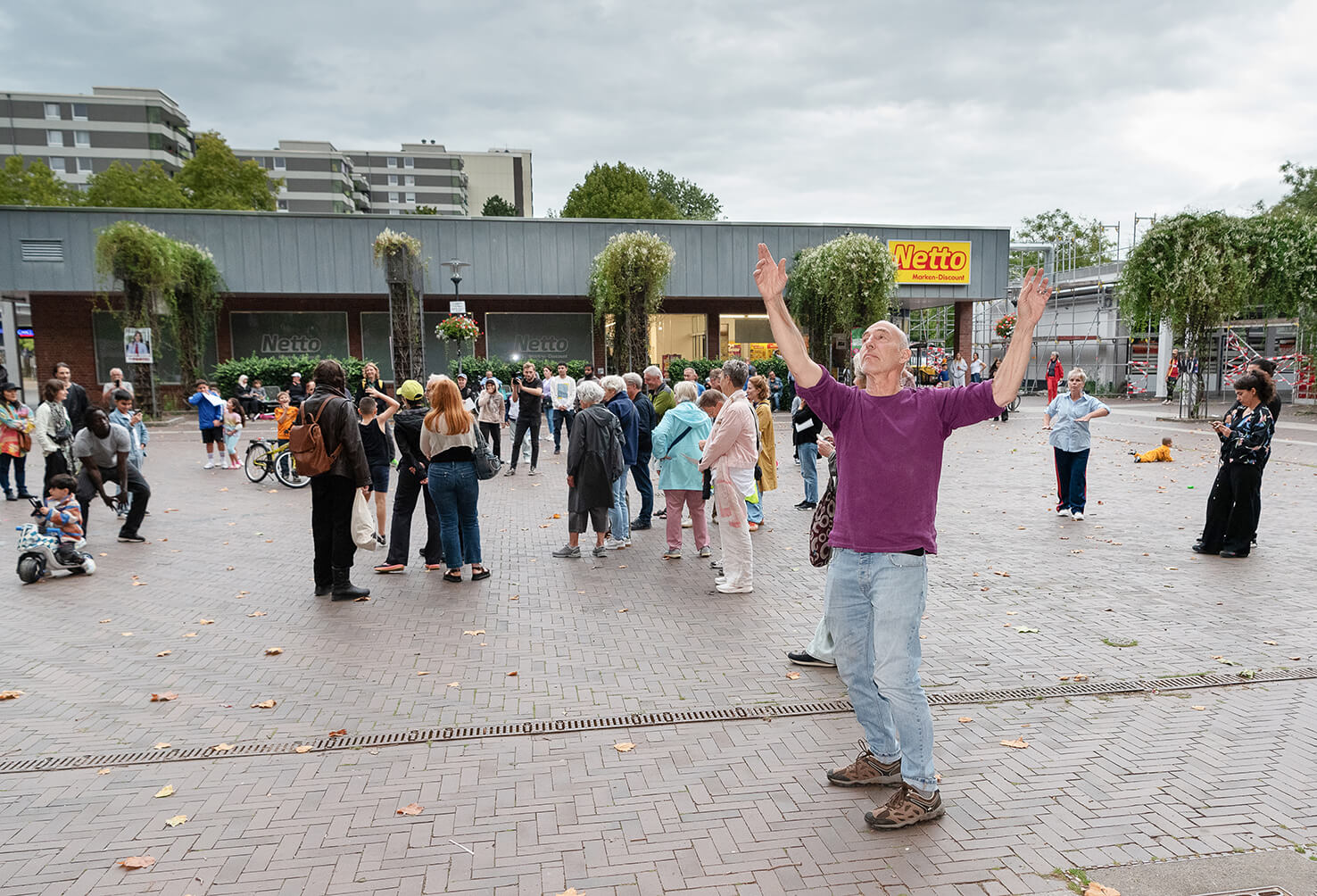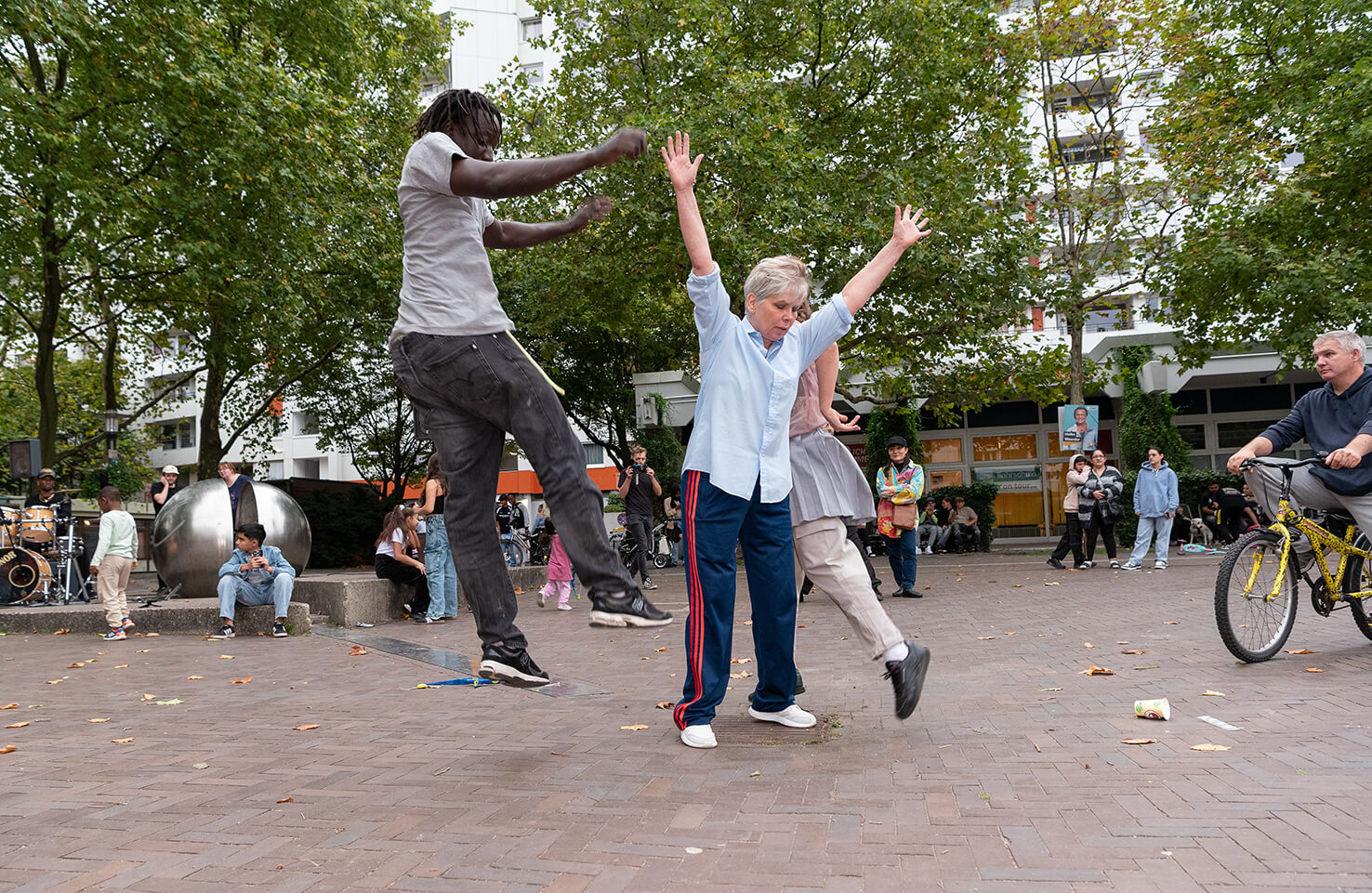 Daria Nazarenko aktivierte den öffentlichen Raum um den Berliner Platz. Mit der Performance CARDIAC zeigte sie einen Nachklang aus den gemeinsamen Tanz-Workshops mit der Nachbarschaft des Senior/innen-Treffs und des Jugendclubs Ratingen-West und experimentierte mit dem daraus entstandenen Bewegungsvokabular des Alltäglichen. Diese Zusammenarbeit fokussierte sich auf die Brücke zwischen Jung und Alt.