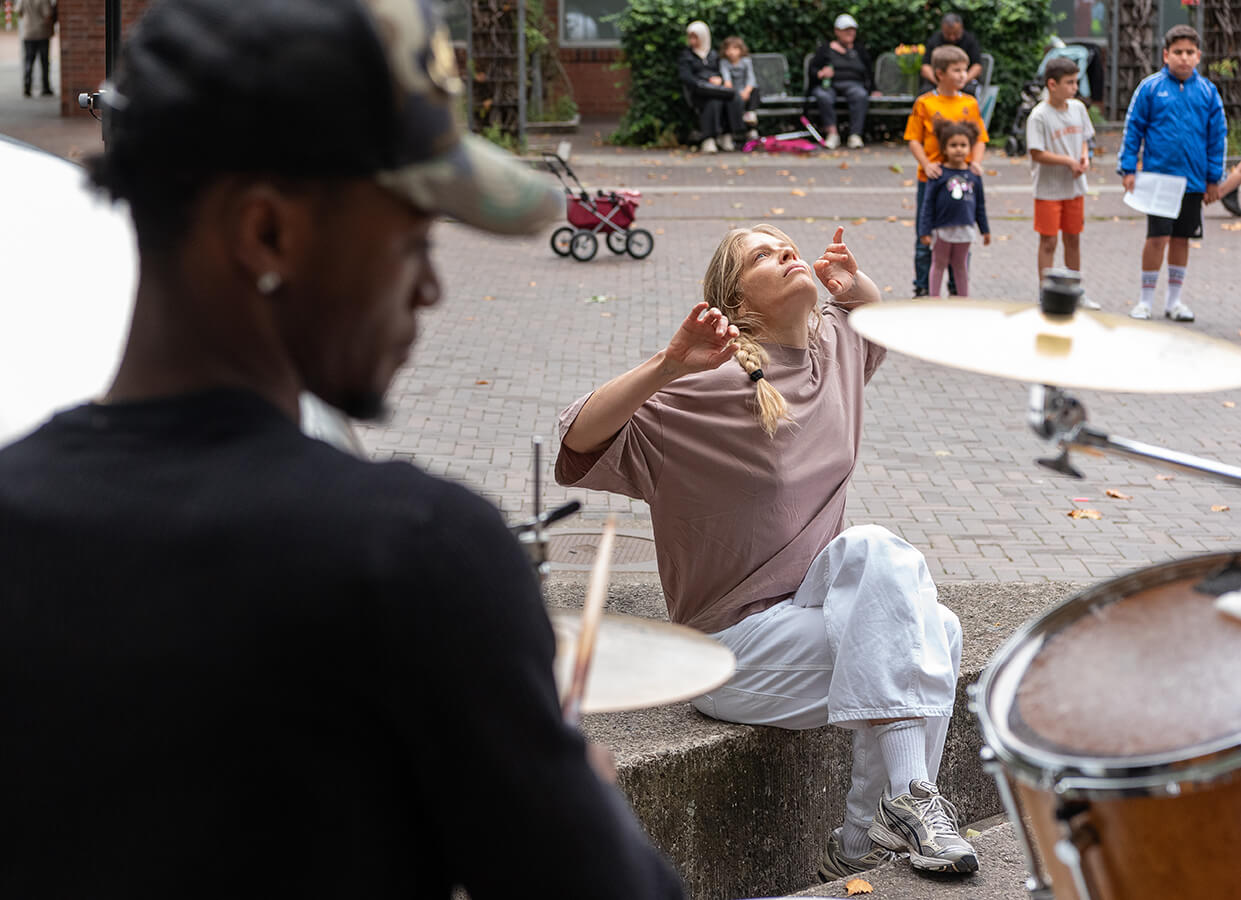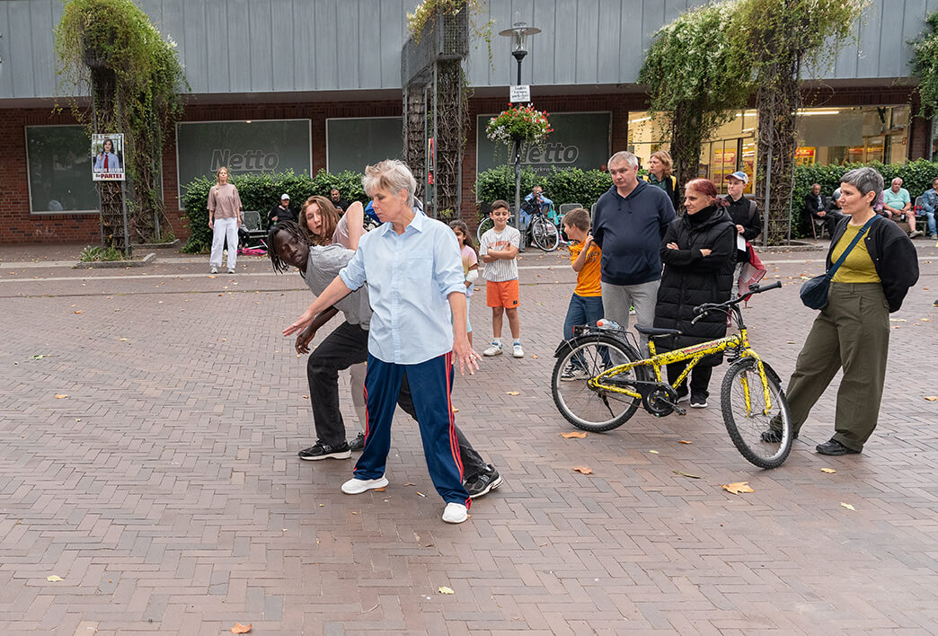 Daria Nazarenko activated the public space around Berliner Platz. With her performance CARDIAC, she presented an echo of the collaborative dance workshops with the neighbourhoods of the Senior Citizens’ Centre and the Youth Club in Ratingen-West, experimenting with the movement vocabulary that emerged from these everyday interactions. This collaboration focused on bridging the gap between young and old.