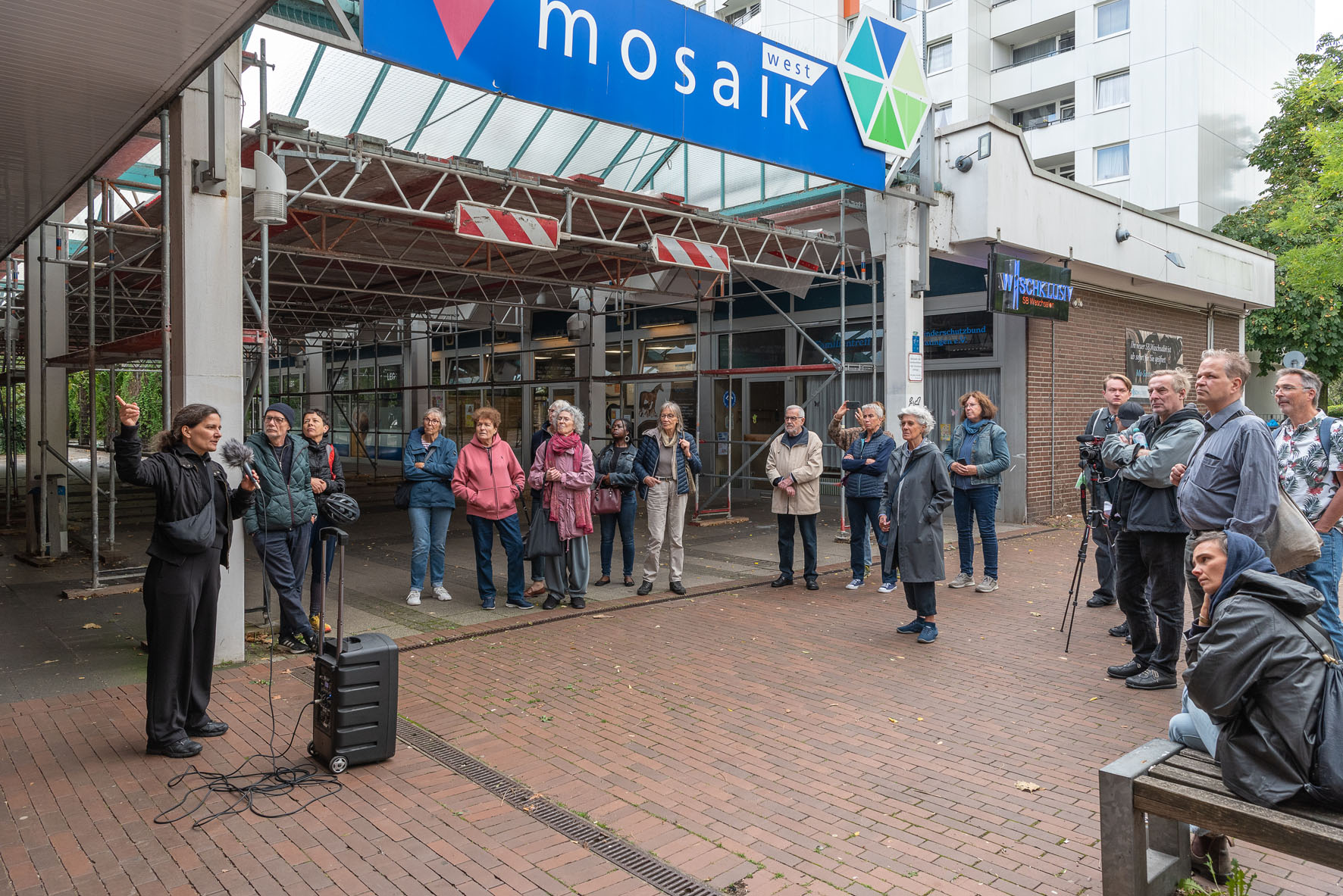 In spring 2023 Anne Schülke participated in their latest project San'azione, a group exhibition. On posters and T-shirts, visitors could see images of various high-rise buildings from Ratingen-West and scan a QR code to listen to an audio work: A young voice speaks a manifesto-like text, asking visitors to reconsider the past and change the present for a different future.