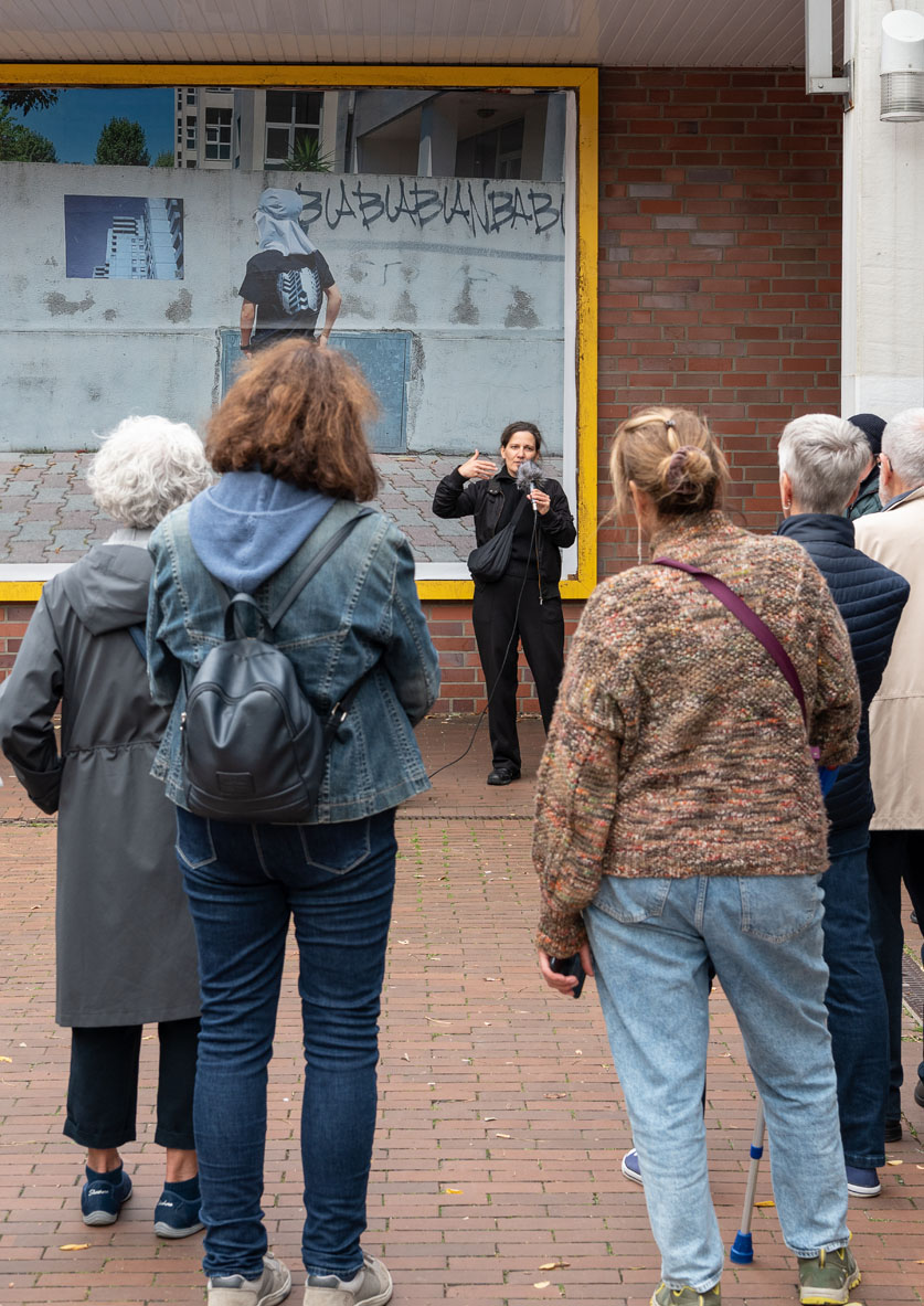 For the people living in Ratingen-West, Anne Schülke photographed a scene in Le Piagge. This image can be seen on a billboard at Berliner Platz. The audio work is accessible via a QR code on the poster and on T-shirts. In German Deutsch, Italian and English.